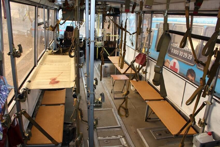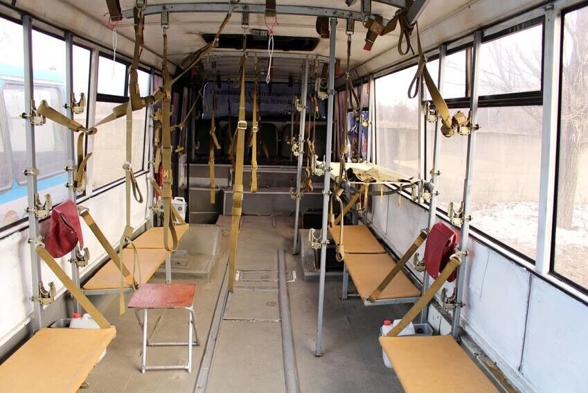 Львовский инженер Михаил Палюх разработал и воплотил в жизнь идею создания медицинского автобуса для эвакуации раненых, сообщает пресс-центр АТО. Для этого из стандартного львовского автобуса ЛАЗ "Лайнер 9" убрали все стандартные кресла, которые заменили скамейки – трансформеры. Также конструктор значительно усилил каркас автобуса и разместил на дополнительных ребрах жесткости кронштейны для полевых носилок. В автобусе предусмотрены специальные полочки для медицинского оборудования и медикаментов и установлен усилитель тока, дающий возможность подключать реанимационную аппаратуру. Сейчас этот "эвакобус" находится на вооружении в 66-м госпитале. Он может принять за раз 29 тяжелораненых или лежачих бойцов.