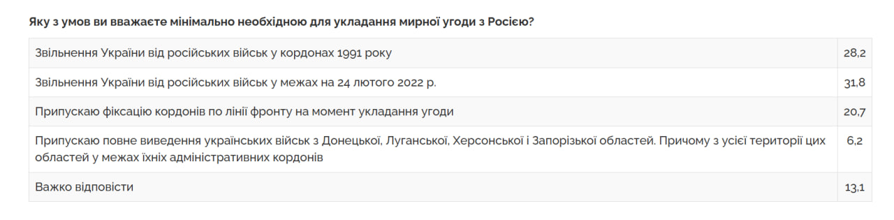 Относительно того, какое из условий для заключения мирного соглашения с РФ минимально необходимо, 31,8% украинцев заявили, что договоренность должна содержать пункт об освобождении Украины от оккупантов в пределах на 24 февраля 2022 года, 28,2% – в пределах 1991 года.
