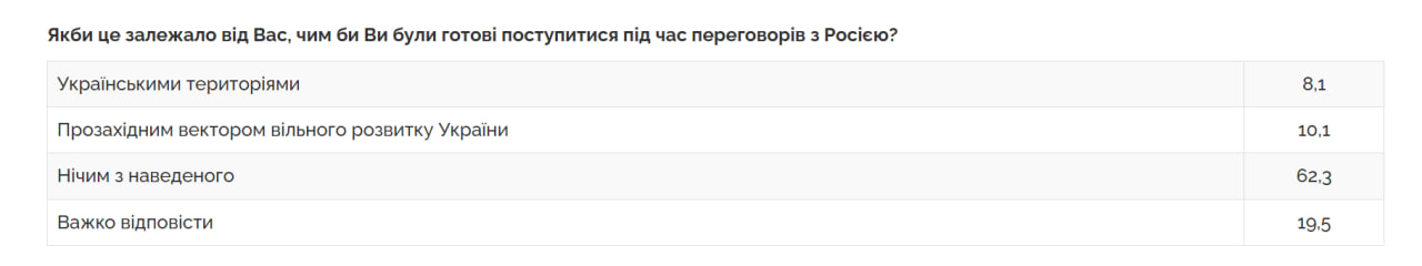 На вопрос о том, чем готовы пожертвовать украинцы в переговорах с Россией – территориями или прозападным вектором, – 62,3% человек ответили, что ничем, 10,1% согласились остановить европейское развитие страны, 8,1% ответили, что готовы уступить украинские территории.