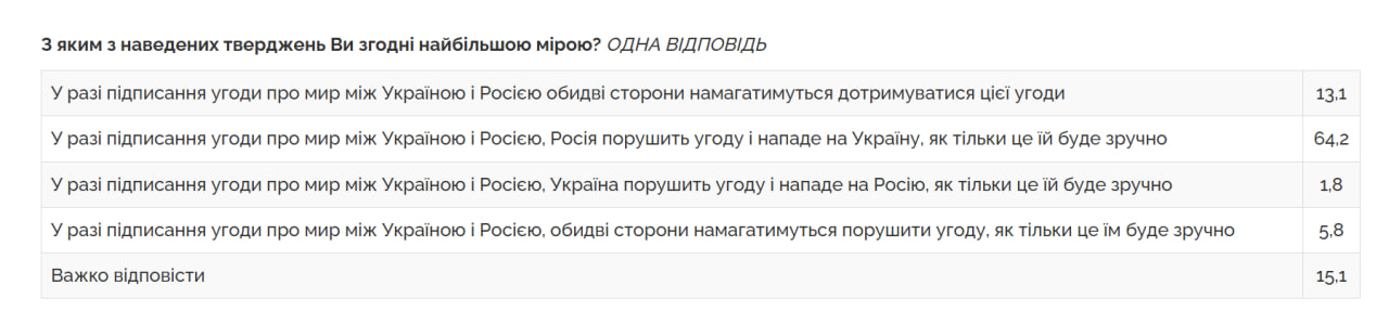 В случае подписания мирного соглашения 64,2% опрошенных считают, что Россия нарушит его и нападет на Украину, как только это ей будет удобно. В соблюдение условий сторонами верят 13,1% респондентов, 1,8% и 5,8% предположили, что Украина может нарушить договоренность или обе страны ее не будут соблюдать соответственно.