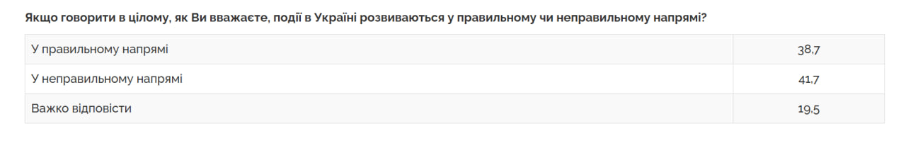 Также большинство принявших участие в исследовании считают, что сейчас события в Украине развиваются в неправильном направлении – 41,7% против 38,7%. По данным опроса, который провел в августе Фонд "Демократические инициативы" имени Илька Кучерива совместно с социологической службой Центра Разумкова, в августе 40% людей, живущих на подконтрольной украинским властям территории, считали, что события в Украине развиваются в правильном направлении.