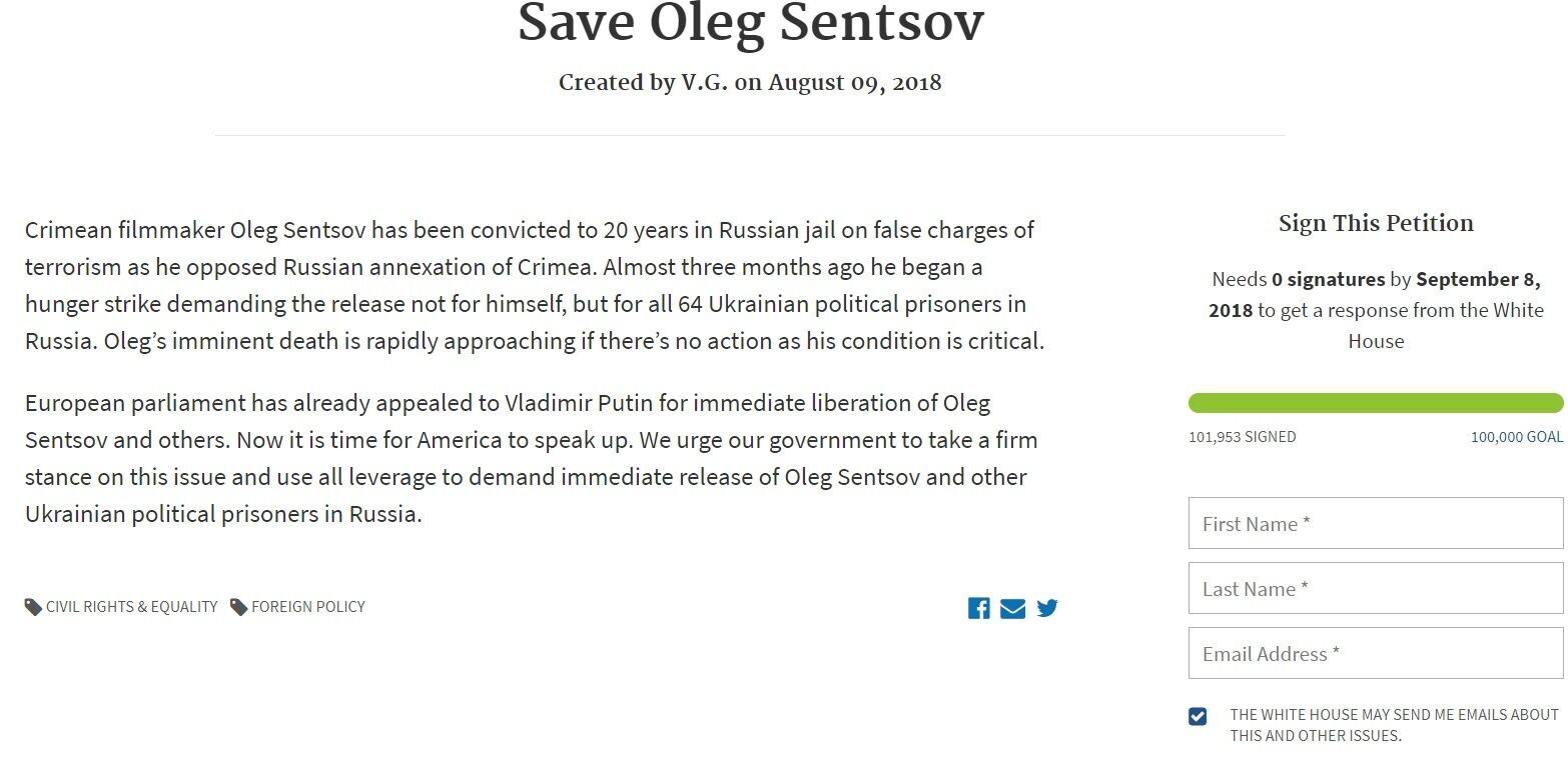 Петиция на сайте Белого дома США за немедленное освобождение украинского политзаключенного Олега Сенцова набрала необходимое количество голосов.