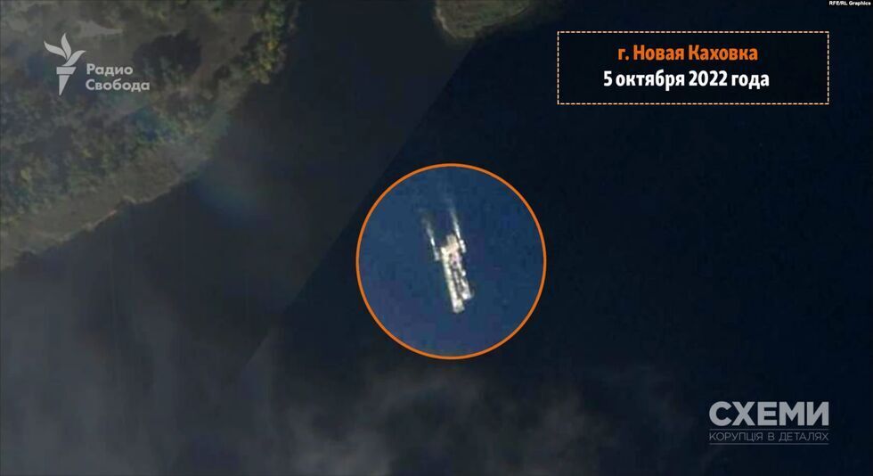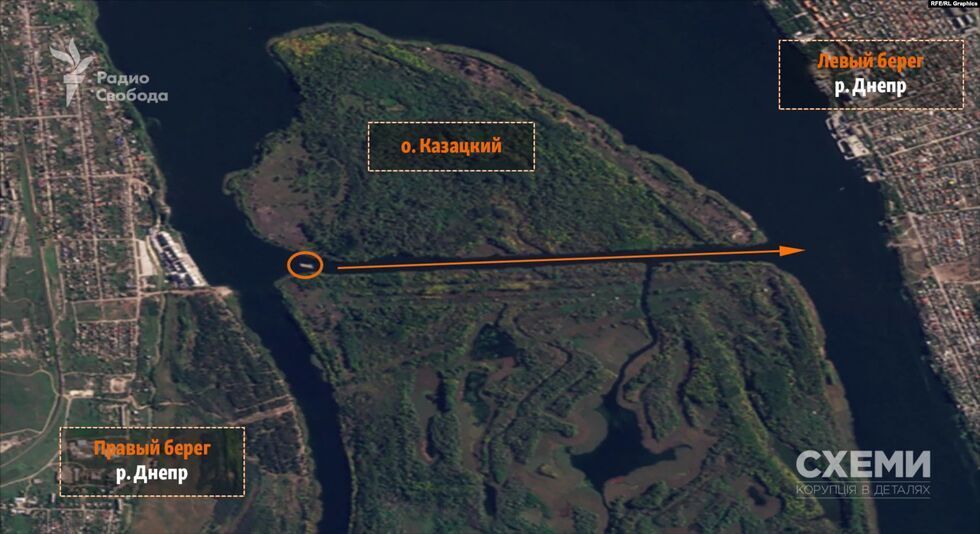 Расследователи определили геолокацию этого ролика – видео было снято недалеко от правого берега Днепра в районе Казацкого. Журналисты, в распоряжении которых есть спутниковые снимки местности, пришли к выводу, что паром направляется в устье канала, который соединяет этот поселок и расположенную на левом берегу Новую Каховку, проходя мимо острова Казацкий.