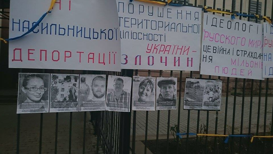 Активисты хотят выразить свой протест против агрессии России по отношению к Украине, а также привлечь внимание к нарушению прав человека в со стороны оккупационных "властей" Крыма. Они повесили на заборе посольства плакаты: "Нет насильственной депортации", "Идеология "Русского мира" — нацистская идеология", "Нет террору мирных жителей", а также портреты украинских волонтеров, журналистов и активистов, которые пострадали от российской агрессии.