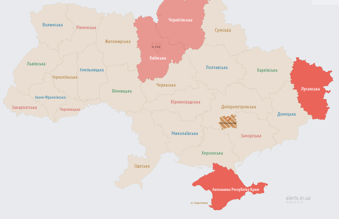 В Киевской области тревога была объявлена в 0.35 6 июня. По данным онлайн-сервиса alerts.in.ua, также воздушная тревога объявлена в Киеве (в 0.54) и Черниговской области, Луганской области и временно оккупированном Крыму.