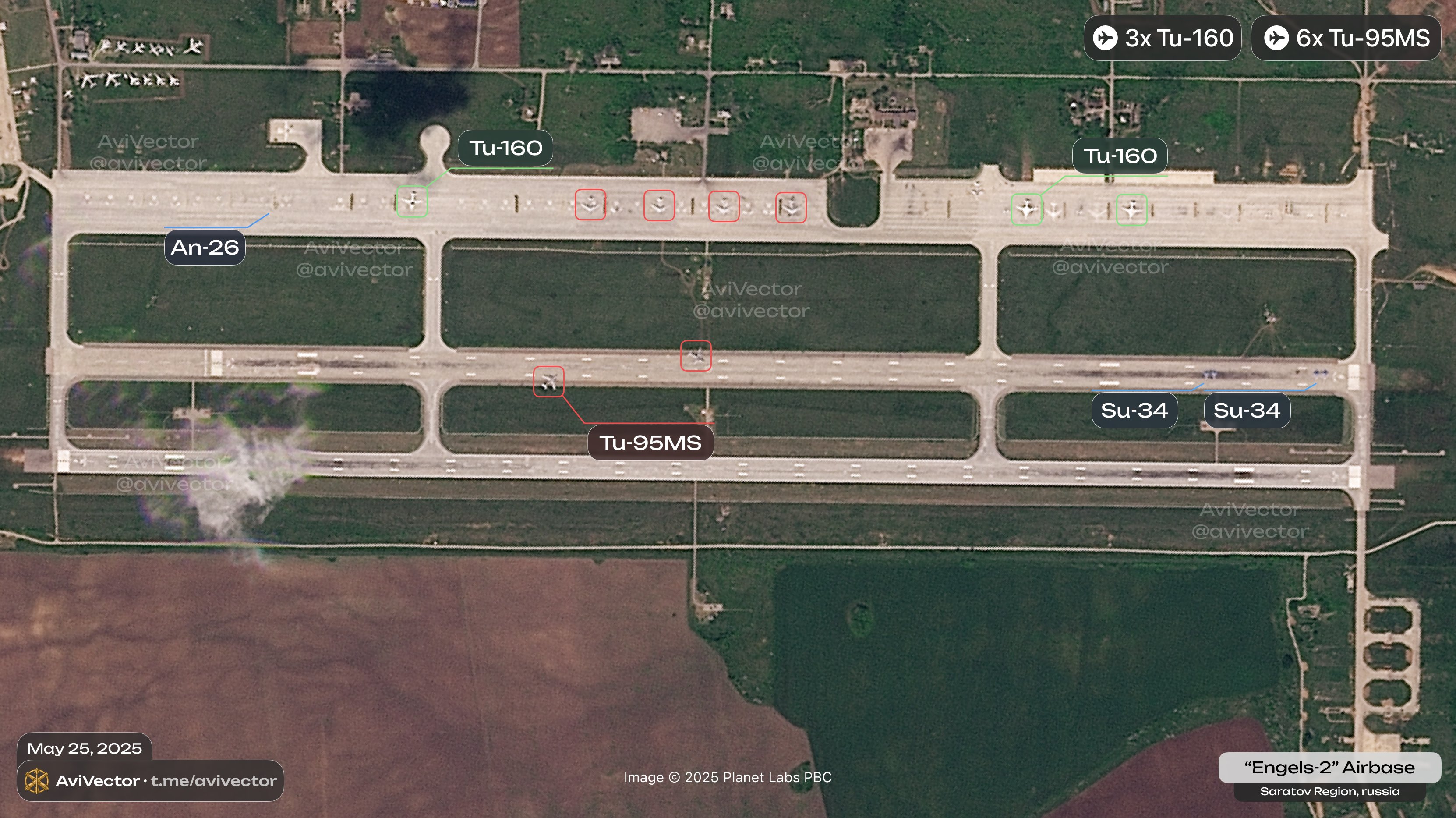 Аналитики Defense Express обратили внимание на спутниковые снимки аэродрома Энгельс в Саратовской области, которые также обнародовал ресурс AviVector. Они демонстрируют, что 25 мая на базе было шесть стратегических бомбардировщиков Ту-95МС, три Ту-160 и четыре фронтовых бомбардировщика Су-34. Но уже на следующий день, 26 мая, на аэродроме осталось по три Ту-95МС и Ту-160, а также два Су-34.