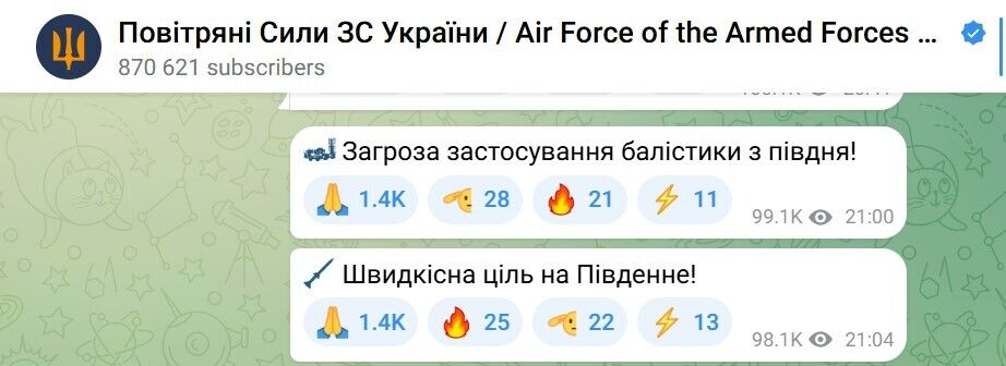 Кроме того, что оккупационные войска РФ активно в течение суток атаковали мост в Маяках, Воздушные силы ВСУ в 21.00 предупредили об угрозе применения баллистики с юга, а после этого – о движении скоростной цели на Пивденное.