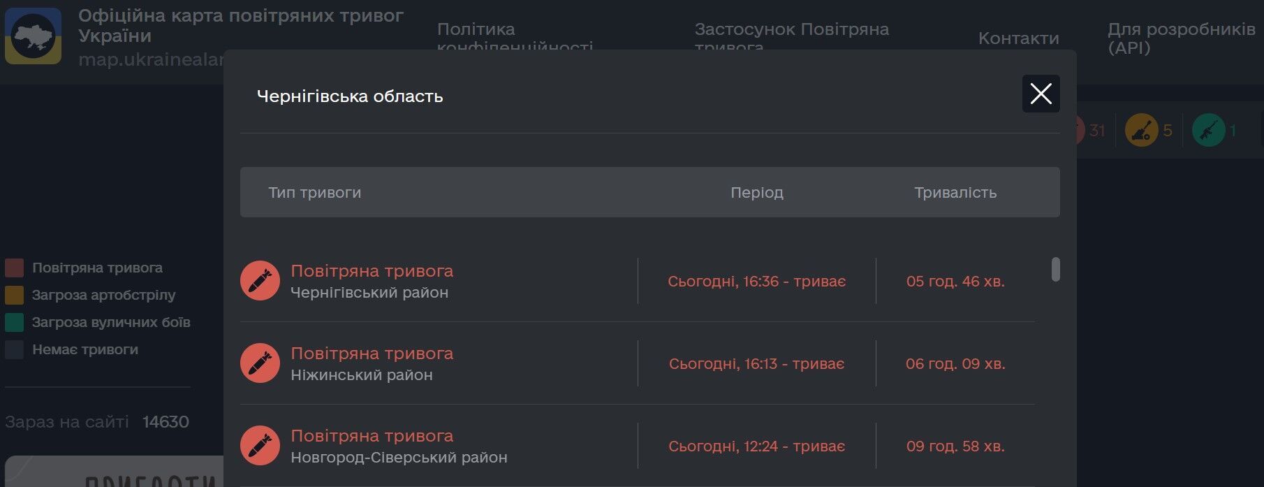 Согласно карте воздушных тревог Украины, тревогу в Нежинском районе объявили в 16.13, она продолжается до сих пор.