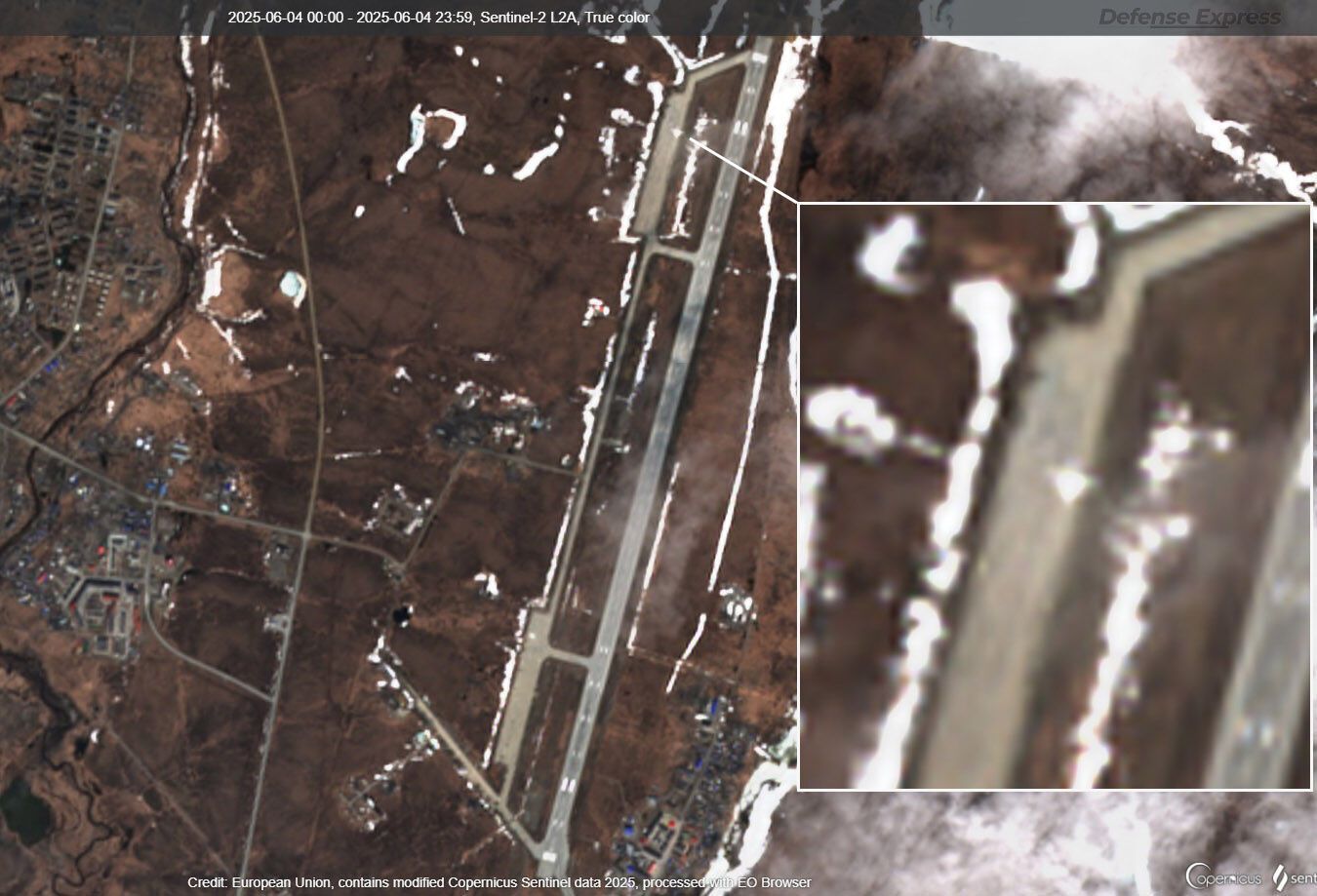 Страна-агрессор Россия после украинской спецоперации Службы безопасности Украины "Паутина", во время которой были уничтожены десятки военных самолетов РФ, спрятала свой Ту-160 на авиабазе Анадырь (Угольный) на Чукотке в 6,6 тыс. км от Украины. Об этом свидетельствует новый снимок спутника Sentenel от ESA за 4 июня, пишет Defense Express.