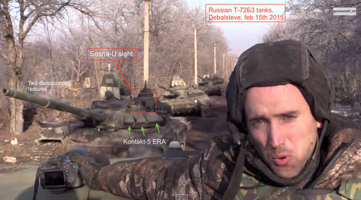 Еще летом сепаратисты на Донбассе снимали с постаментов танки времен Второй мировой войны. Теперь в этом нет необходимости, потому что танков у "армии Новороссии" предостаточно. В своем репортаже с окраин Дебальцево британский журналист Грэм Филлипс показал колонну танков Т-72Б3, которые есть на вооружении только у российской армии. От базовой модели Т-72 этот танк отличается дополнительными комплектующими, наличие которых четко видно в кадре.