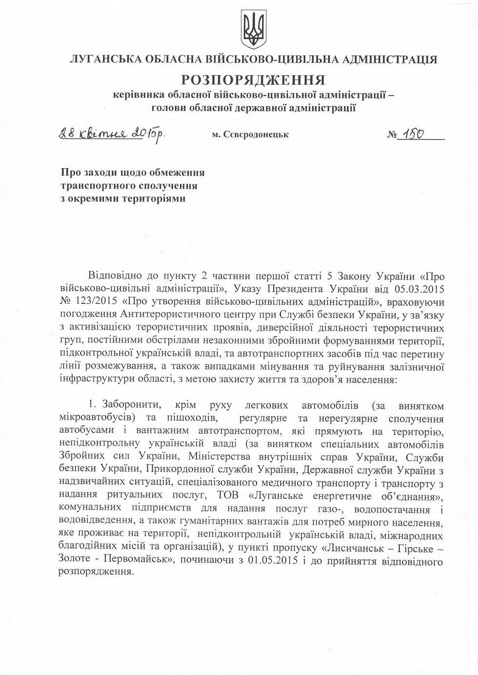 Этим же документом он запретил движение грузовиков и автобусов через единственный действующий в Луганской области пункт пропуска Лисичанск – Горское – Золотое – Первомайск.