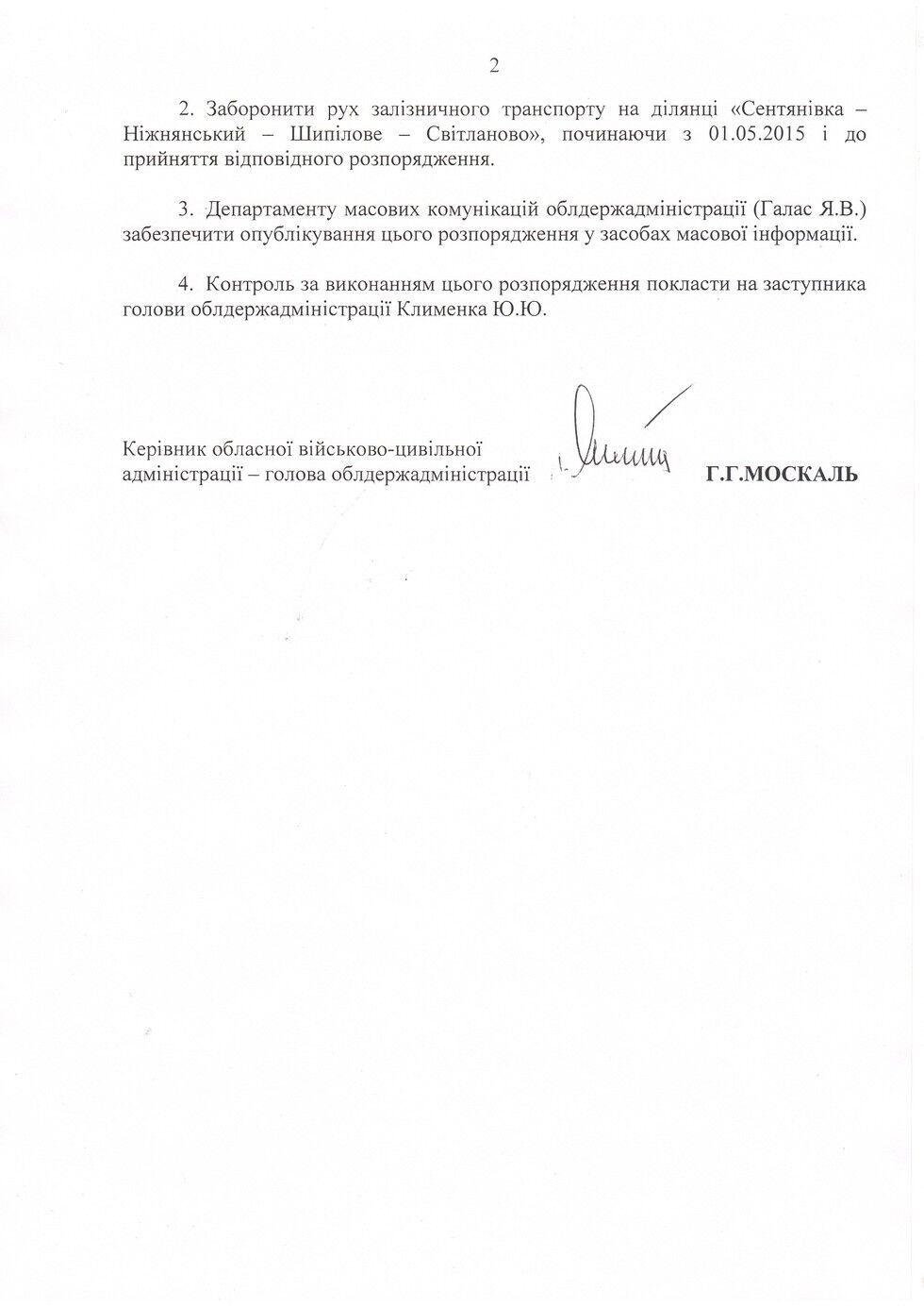 Руководитель Луганской областной военно-гражданской администрации Геннадий Москаль подписал распоряжение, которым с 1 мая запретил движение поездов на участке Сентяновка – Светланово (Луганская область). Фотокопию документа Москаль выложил на своем сайте.