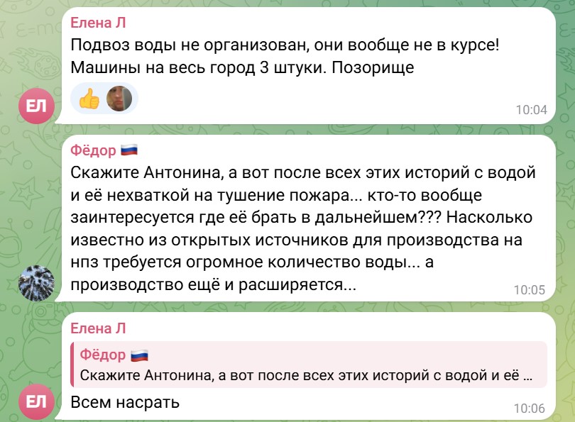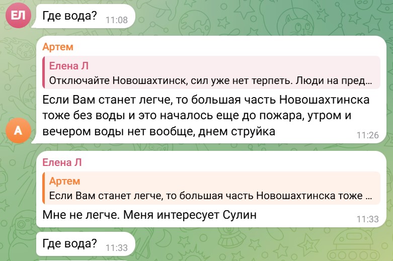 "Если вам станет легче, то большая часть Новошахтинска тоже без воды, и это началось еще до пожара, утром и вечером воды нет вообще, днем – струйка", – написал пользователь Артем.