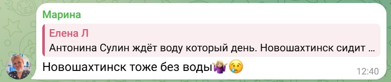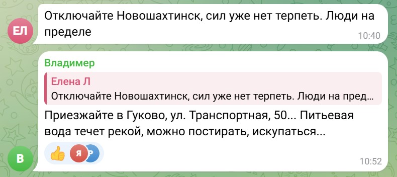 Пользователь Елена Л. призвала отключить воду в Новошахтинске, поскольку "сил уже нет терпеть. Люди на пределе". В ответ ей предложили приехать в Гуково, постирать там вещи и искупаться, "питьевая вода течет рекой".