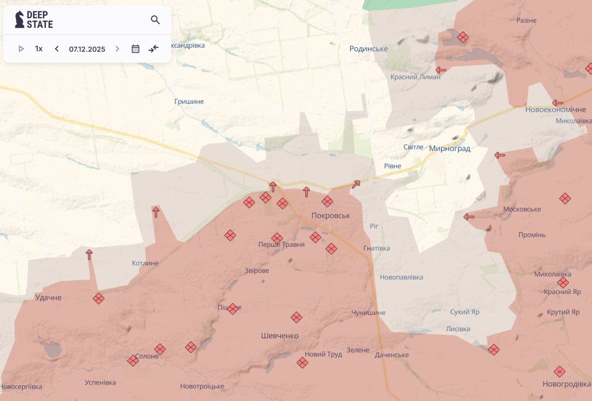 Накануне, вечером 7 декабря, аналитический проект DeepState, который сотрудничает с Минобороны Украины, проинформировал, что российские оккупанты продвинулись в районе Мирнограда.