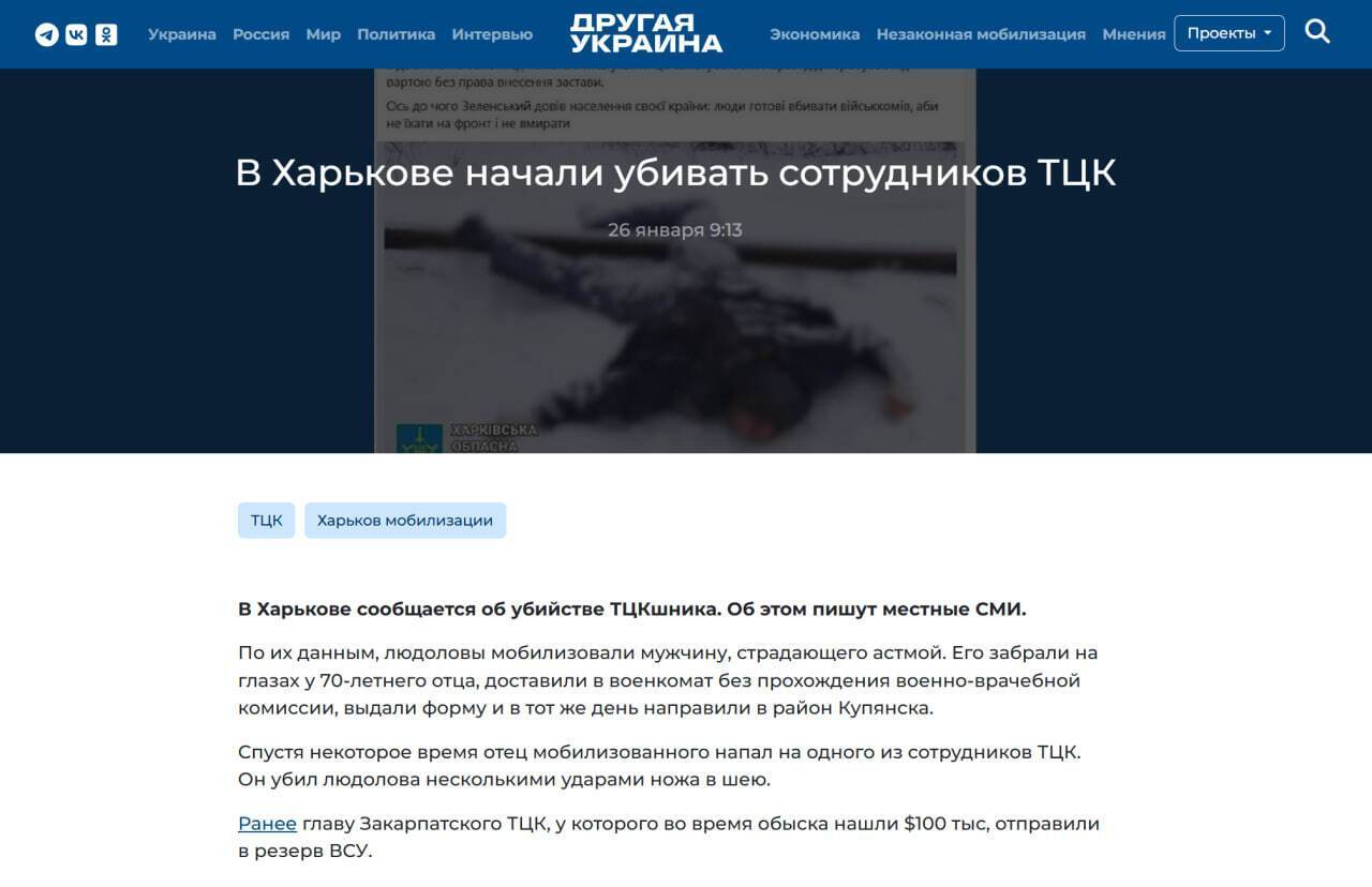Несмотря на опубликованное ТЦК опровержение, 26 января пропагандисты сайта "Другая Украина", связанного с обвиняемым в государственной измене бывшим народным депутатом Украины Виктором Медведчуком, выпустили фейк об "убийстве людолова" со ссылкой на некие "местные СМИ". Ни ссылок на источники, ни каких-либо доказательств, ни информации от ТЦК в публикации нет.