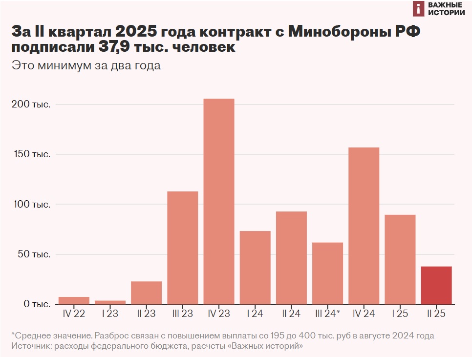 "За второй квартал 2025 года выплаты за заключение контракта с минобороны получили 37,9 тыс. человек. [...] По сравнению с аналогичным периодом 2024 года число вступивших в армию РФ упало в 2,5 раза – тогда бонусы за заключение контракта получили 92,8 тыс. человек", – говорится в материале.