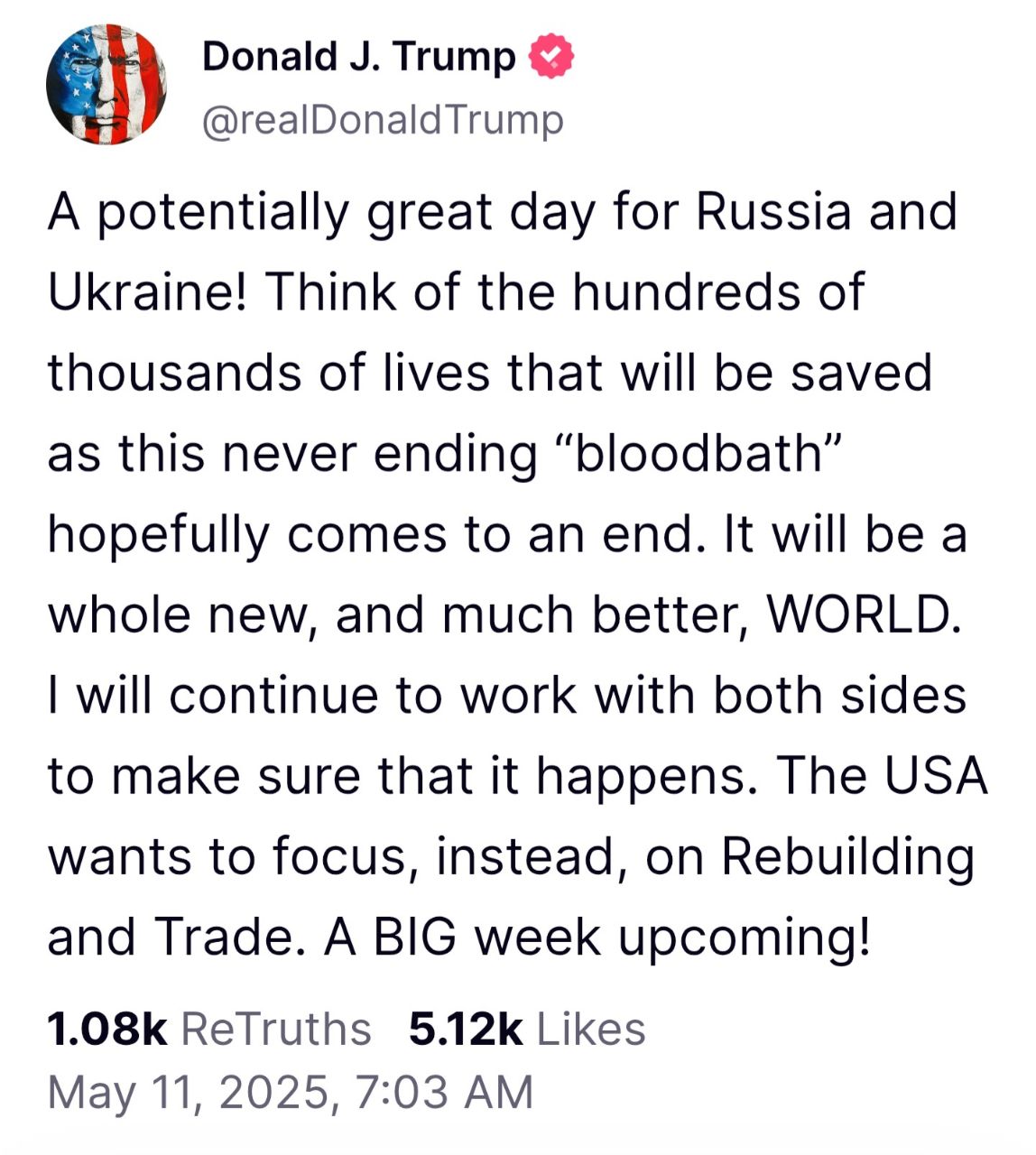 "Потенциально великий день для России и Украины! Подумайте о сотнях тысяч жизней, которые будут спасены, когда эта бесконечная "кровавая баня", надеемся, закончится. Это будет совершенно новый и гораздо лучший мир", – заявил Трамп.