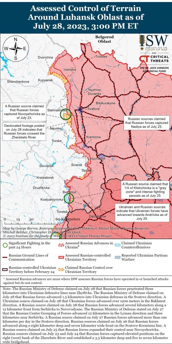 "Некоторые блогеры признают, что 27 июля украинские войска захватили Старомайорское. Украинский источник утверждает, что Вооруженные силы Украины продвинулись на 10–12 км от основной линии обороны РФ на бердянском направлении... Командир российского батальона "Восток" Александр Ходаковский заявил, что украинские войска могут наносить удары по всей глубине обороняющихся российских войск и что эти удары уничтожают российских командиров и нарушают российское командование и управление", – говорится в сообщении.
