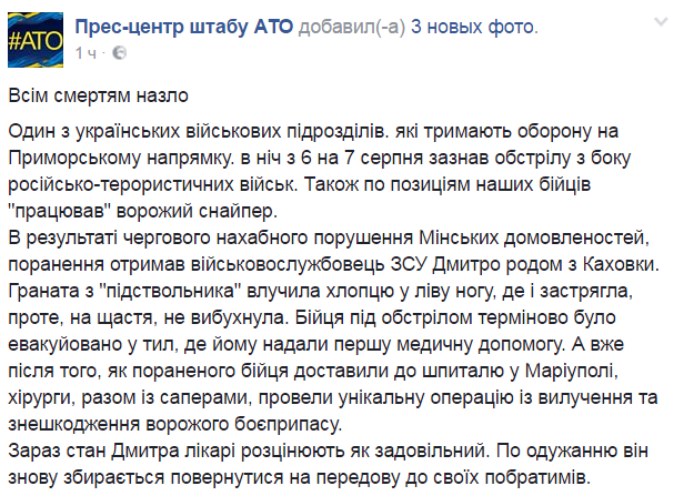 "Одно из украинских военных подразделений, которые держат оборону на приморском направлении, в ночь с 6-го на 7 августа подверглось обстрелу со стороны российско-террористических войск. Также по позициям наших бойцов "работал" вражеский снайпер. В результате очередного наглого нарушения Минских договоренностей ранение получил военнослужащий Вооруженных сил Украины Дмитрий родом из Каховки. Граната из "подствольника" попала парню в левую ногу, где и застряла, однако, к счастью, не взорвалась", – говорится в сообщении.