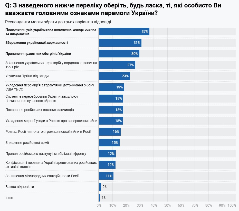 "Для большинства респондентов тремя главными признаками победы Украины в войне станет возвращение всех украинских пленных, депортированных и похищенных (37%), сохранение украинской государственности (31%) и прекращение ракетных обстрелов Украины (30%)", – говорится в публикации.