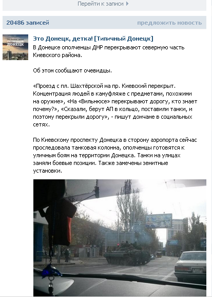По их информации, по Киевскому проспекту Донецка в сторону аэропорта проследовала танковая колонна, ополченцы готовятся к уличным боям на территории Донецка. Танки на улицах заняли боевые позиции. Также замечены зенитные установки.