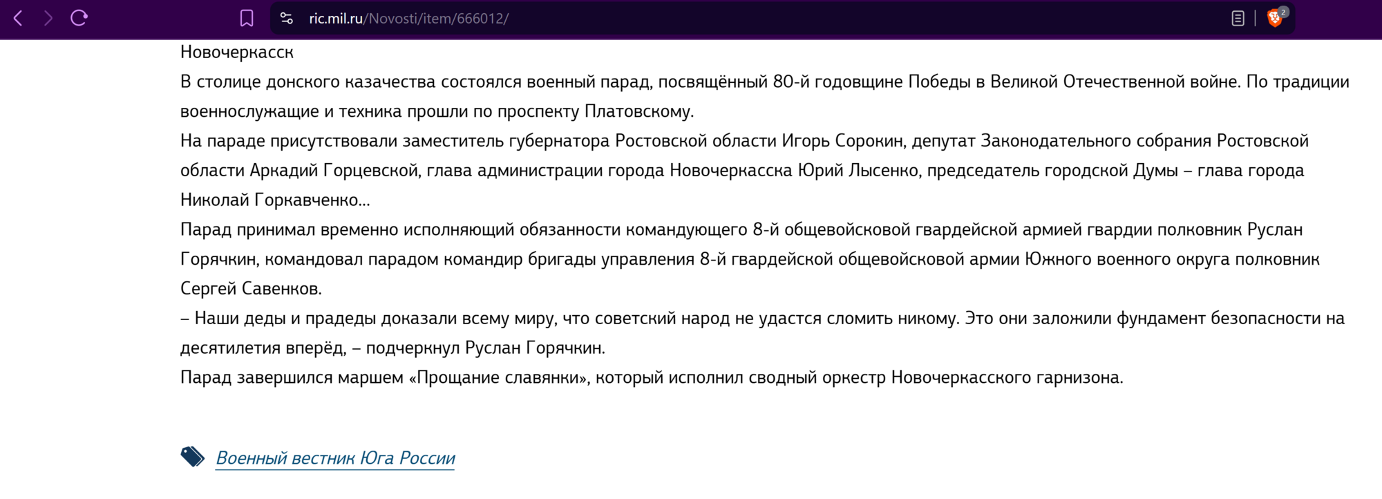Издание российского минобороны "Красная звезда" сообщало, что 9 мая Горячкин принимал военный парад в Новочеркасске. Ресурс военного ведомства страны-агрессора также указывал, что Горячкин занимал должность врио командующего 8-й общевойсковой гвардейской армией РФ.
