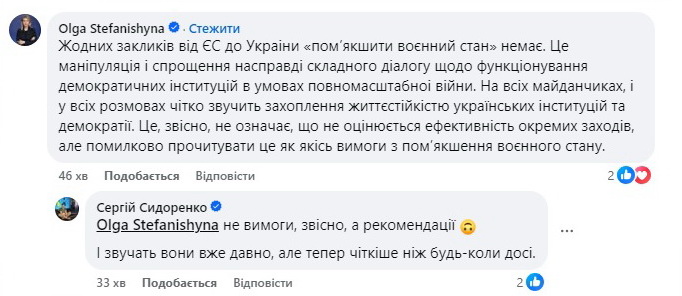Вице-премьер-министр по вопросам европейской и евроатлантической интеграции Украины – министр юстиции Ольга Стефанишина, комментируя в Facebook пост редактора "Европейской правды" Сергея Сидоренко с анонсом материала о конференции, заявила, что ЕС не призывает Украину смягчить военное положение.