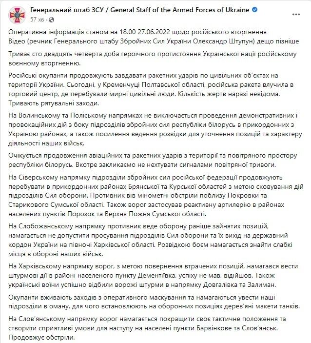 "Также украинские воины успешно отразили вражеские штурмы в направлении Довгалевки и Залимана [Харьковской области]. На славянском направлении враг пытается улучшить свое тактическое положение и создать благоприятные условия для наступления на населенные пункты Барвенково [Харьковской области] и Славянск [Донецкой области]. Продолжает обстрелы", – рассказали в ВСУ.