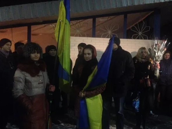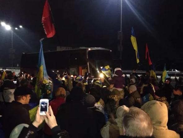 Около 200 киевлян собрались 24 ноября возле станции метро "Бориспольская", куда приехали на ротацию бойцы второго батальона 95-й бригады. Военнослужащие проходят службу в донецком аэропорту, сообщает "Громадське ТБ".
