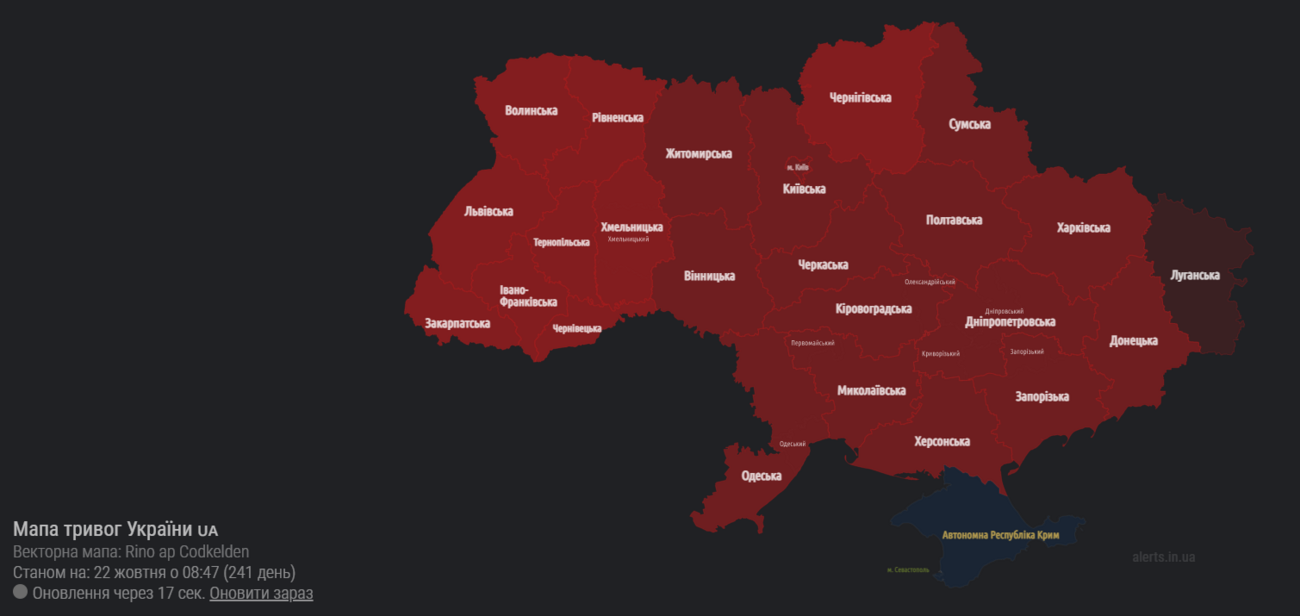 Утром воздушная тревога была объявлена по всей Украине, кроме оккупированного Крыма.