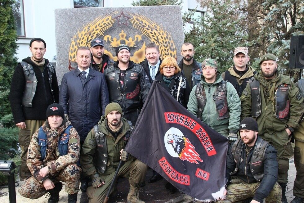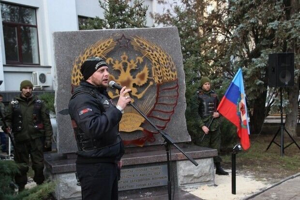 В Луганске участники мотоклуба "Ночные волки" установили памятник, изображающий двуглавого орла в окружении советских снопов.