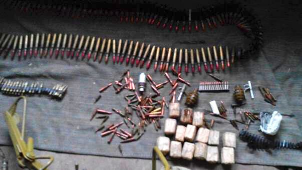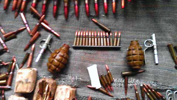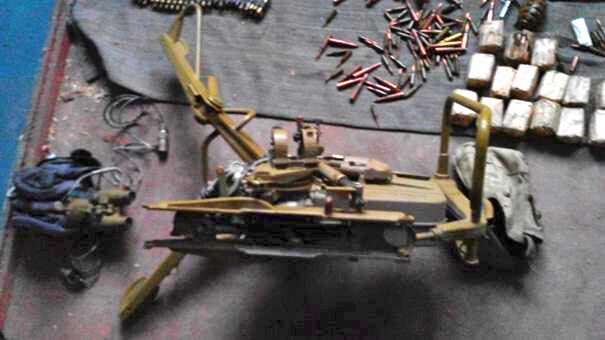 Из тайника изъята бронированная разведывательно-дозорная машина (БРДМ), два прибора наведения для гаубиц, большое количество патронов различных калибров, две гранаты Ф-1, 12 магазинов к пулемету РПК, подставка для гранатомета АГС, шесть приборов наведения к гранатомету РПГ-7, 67 бронежилетов, 42 кевларовые каски и 21 портативная цифровая радиостанция.