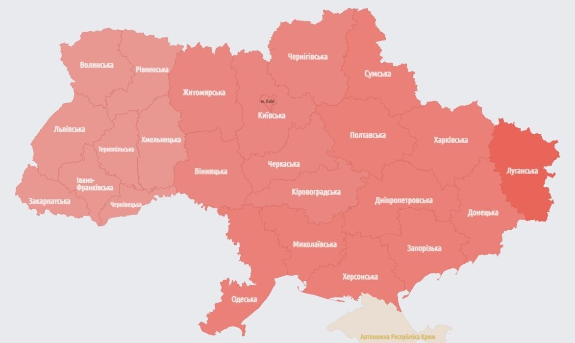 15 ноября в Украине объявлена воздушная тревога во всех регионах, кроме Автономной Республики Крым. Об этом свидетельствует актуальная карта тревог.