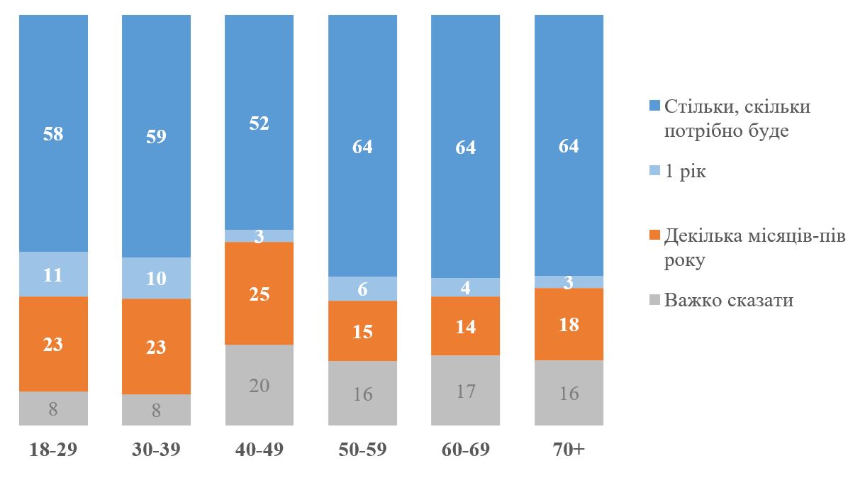 В исследовании социологи отметили следующий момент – восприятие вопросов войны в зависимости от возраста. Как оказалось, независимо от возраста более половины во всех возрастных категориях готовы терпеть войну столько, сколько потребуется. В возрастной категории 18–29 лет – 58%, 30–39 лет – 59%, 40–49 лет – 52%, 50–70 лет – 64%.