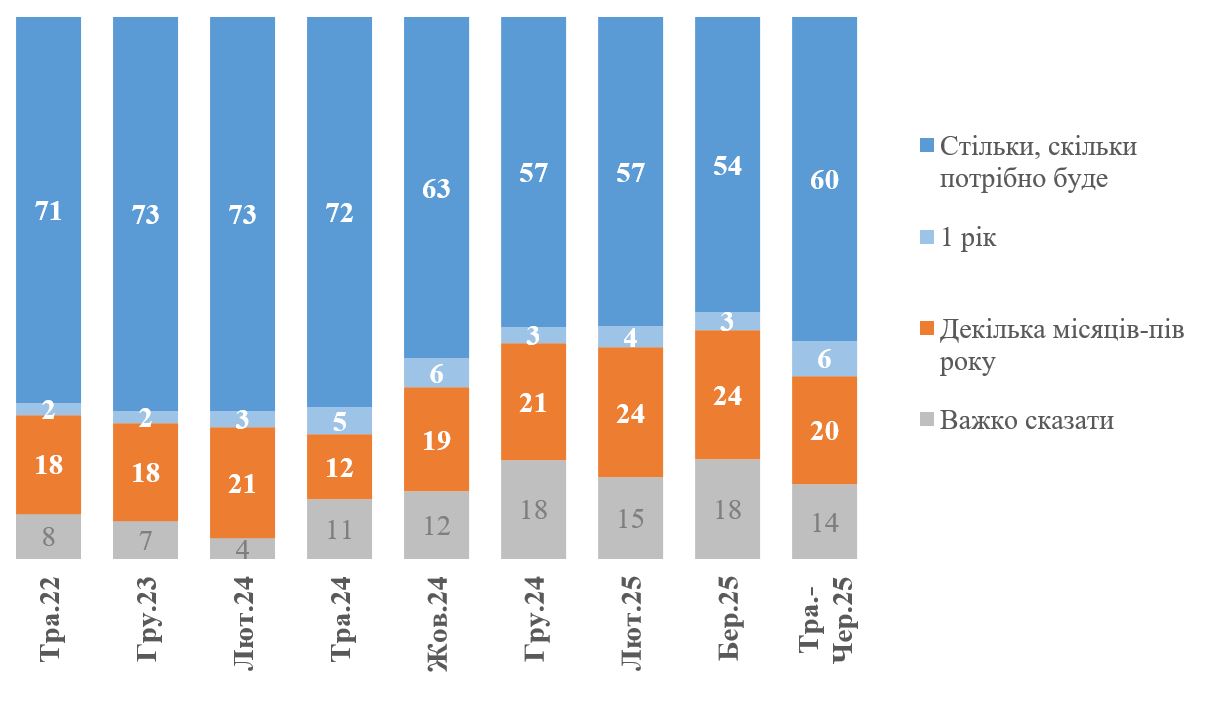 По данным социологов, с начала полномасштабного вторжения РФ до мая 2024 года ситуация практически не менялась: стабильно около 71–73% отвечали, что они готовы терпеть войну столько, сколько потребуется (и еще 2–5% говорили о годе). Отмечается, что о более коротком собственном запасе прочности (несколько месяцев – полгода) говорили 12–21%.