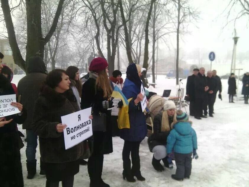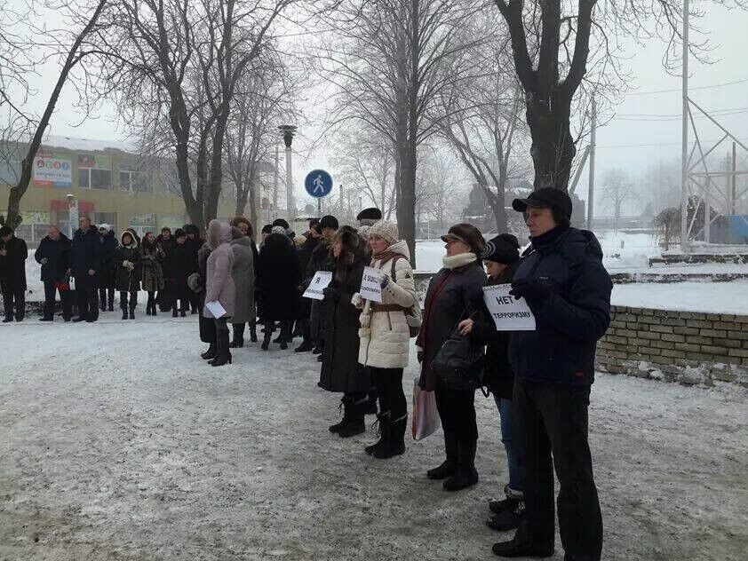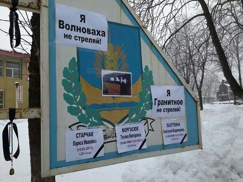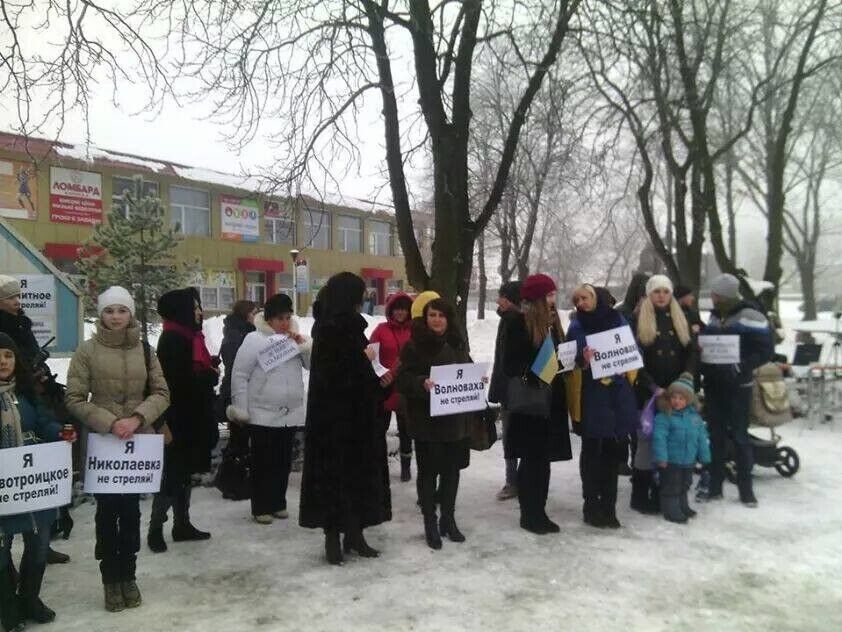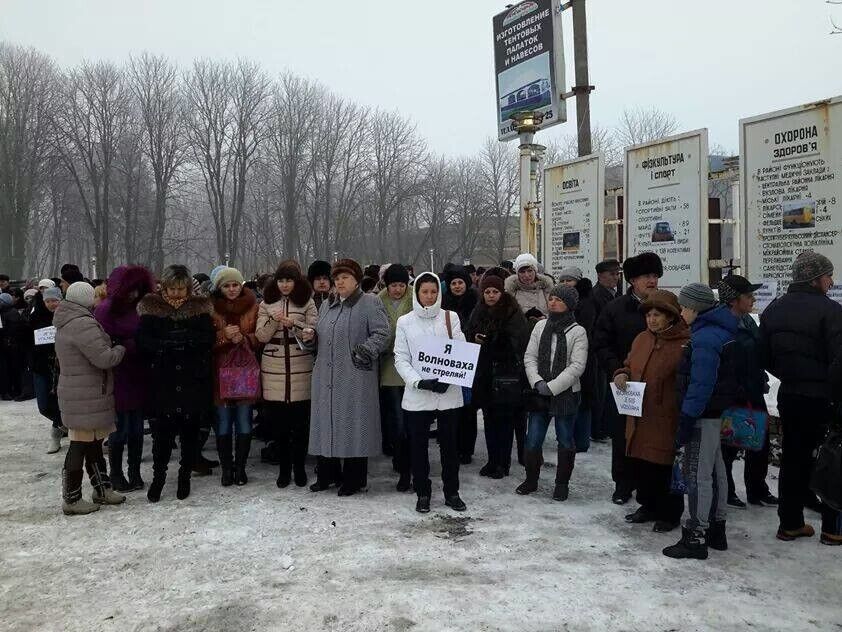 В Волновахе Донецкой области около 150 человек собрались на митинг памяти 12 человек, которые погибли 13 января в результате попадания осколков от снаряда из "Града" в автобус. Об этом сообщается на странице Васиссуалия Нечипоренко в Facebook. Люди держали в руках таблички "Нет терроризму", "Я Волноваха. Не стреляй", "Я Гранитное. Не стреляй". Люди зажгли свечи и написали на плакатах имена погибших пассажиров.