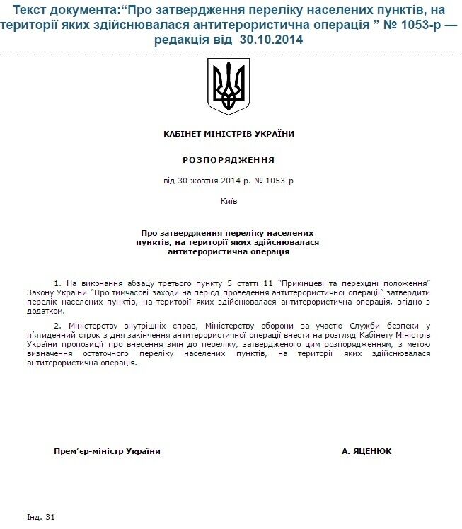 Кабинет Министров Украины утвердил перечень населенных пунктов, на территории которых проводилась антитеррористическая операция (АТО). Об этом говорится в распоряжении правительства №1053-р от 30 октября, опубликованном на его официальном сайте.