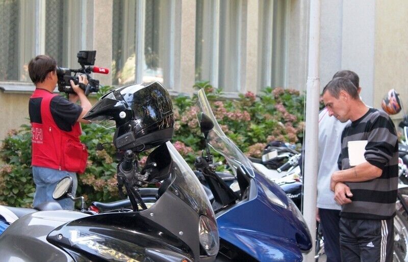 Военные и родственники, которые пришли их навестить, рассматривали мотоциклы, примеряли шлемы и фотографировались на память с владельцами транспорта.