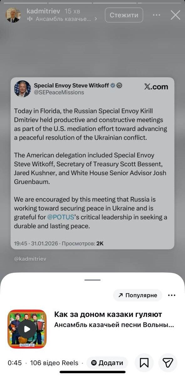 Дмитриев опубликовал в Instagram скриншот сообщения Виткоффа, поставив под него в Instagram-stories песню "Как за доном казаки гуляют" в исполнении русского ансамбля "Вольный Дон".