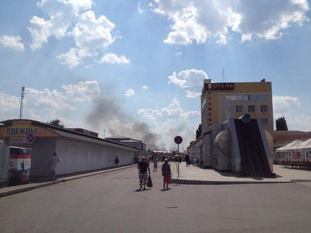 15.57 В результате минометного обстрела один из снарядов попал в торговые ряды на рынке возле железнодорожного вокзала в Донецке и вызвал пожар.