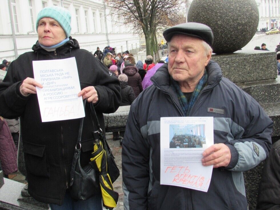 Около 300 жителей Полтавы собрались возле здания местного городского совета, требуя признать "ДНР" и "ЛНР" террористическими организациями, а Россию – страной-агрессором. Вчера горсовет Полтавы провалил соответствующее решение, что вызвало негодование полтавчан, пишет Gazeta.ua. Люди держат транспаранты: "Депутаты – предатели", "Агентов Кремля вон", "Полтава – город патриотов". Перед митингующими выступил нардеп от Блока Петра Порошенко Сергей Каплин и депутат местного горсовета Александр Артеменко.