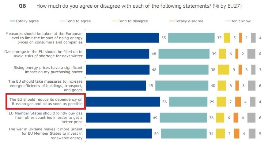 Жителям всех 27 стран Евросоюза задавали вопрос, согласны ли они с утверждением, что "ЕС должен уменьшить свою зависимость от российских нефти и газа как можно скорее".
