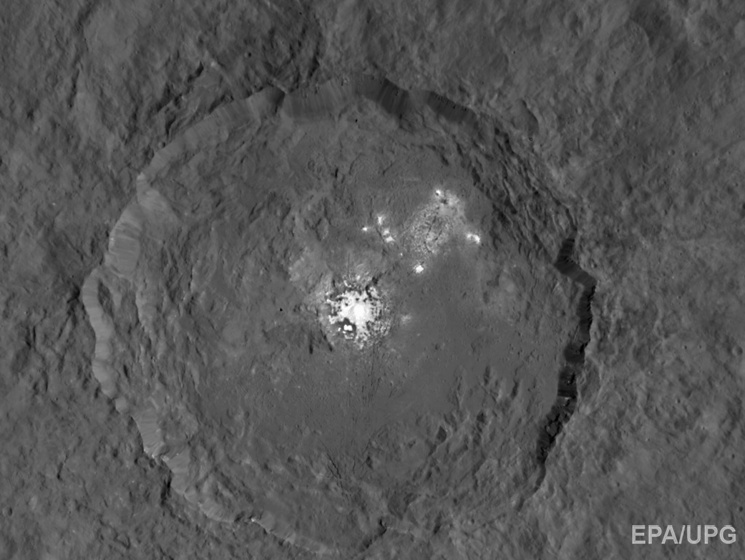 Специалисты точно не знают, какова природа этих пятен. Они намного ярче, чем окружающая их поверхность кратера. Вероятно, они образованы водяным льдом.