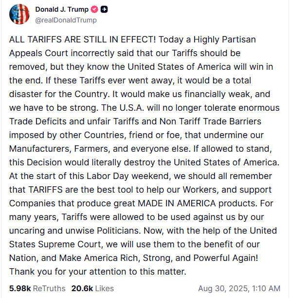 "Сегодня Апелляционный суд, отличающийся высокой партийной приверженностью, ошибочно заявил, что наши тарифы должны быть отменены, но они знают, что Соединенные Штаты Америки в конечном счете победят. Если эти тарифы когда-нибудь исчезнут, это будет настоящей катастрофой для страны", – заявил он.