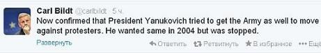 "Сейчас подтверждено, что Янукович пытался выдвинуть армию против протестующих. Это же он хотел сделать в 2004 году, но тогда его остановили", – пишет Бильдт.