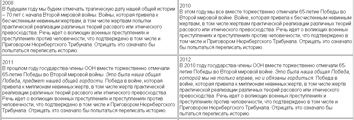 Штенгель приводит сравнительную характеристику выступлений за восемь лет. По его словам, за этот период были внесены лишь незначительные правки. Блогер назвал копирование речей "днем сурка в ООН".