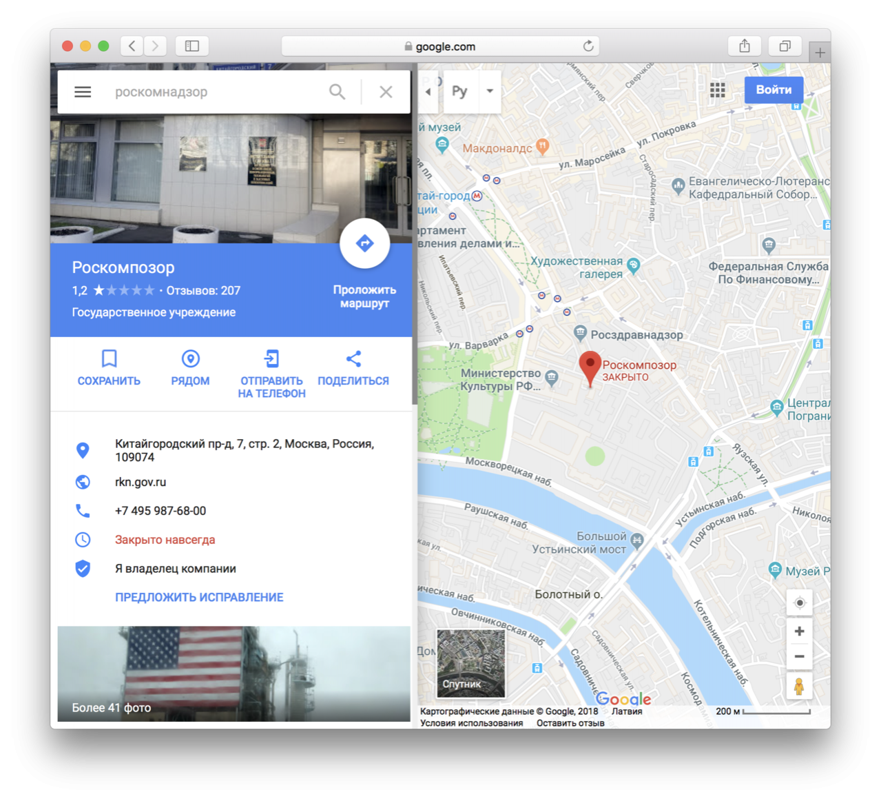 Главное здание ведомства на Китайгородском проезде в Москве удалось переименовать в Роскомпозор. Вместо часов работы указали "Закрыто навсегда". В категории учреждения появилось "гей-бар" и "психоневрологический диспансер". Утром пятницы в карточке Роскомнадзора возобновили прежнюю категорию – "государственное учреждение".
