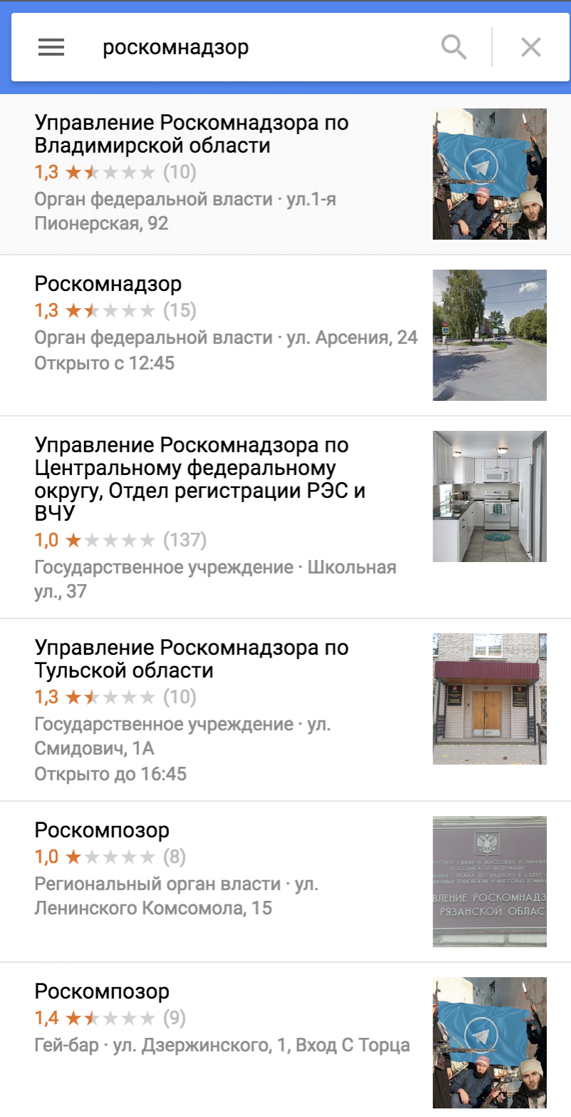 Пользователи также оставили Роскомнадзору десятки негативных отзывов, из-за чего его рейтинг снизился до 1,2 из 5. В раздел с фотографиями, сделанными в учреждении, они загрузили коллажи с людьми, похожими на террористов, позирующими на фоне флага с логотипом мессенджера Telegram, а также фото обложки книги "Что такое терроризм".