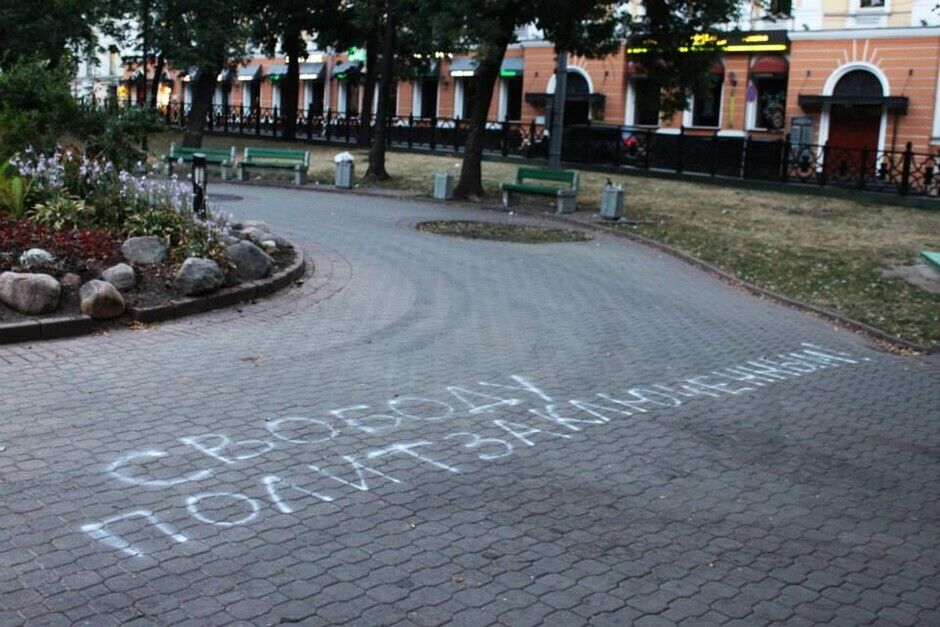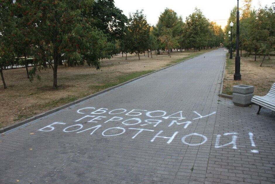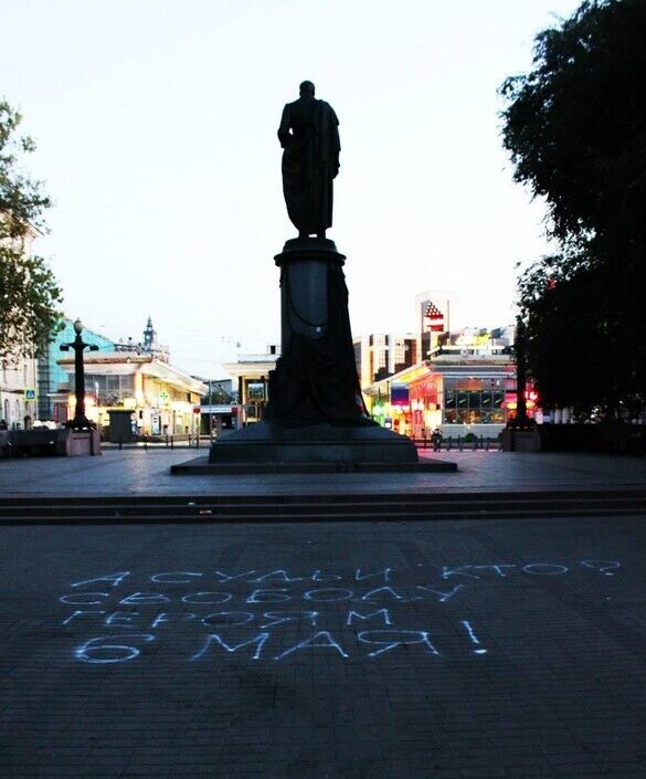 Активисты украсили центр столицы РФ надписями "Свободу политзаключенным", "Слава героям Болотной" и трафаретами, изображающими сбитые российскими ракетами самолеты. "Ребята из Московской сотни провели информационное окружение Кремля", сообщил в Facebook один из участников акции Владислав Бурлуцкий.